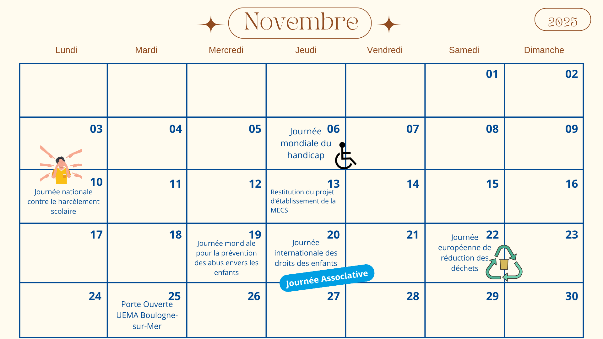 Notre agenda, mis à jour tous les deux mois, vous permet de découvrir les dates clés de notre association ainsi que les journées mondiales et nationales importantes. Consultez le régulièrement pour ne rien manquer des événements marquants !