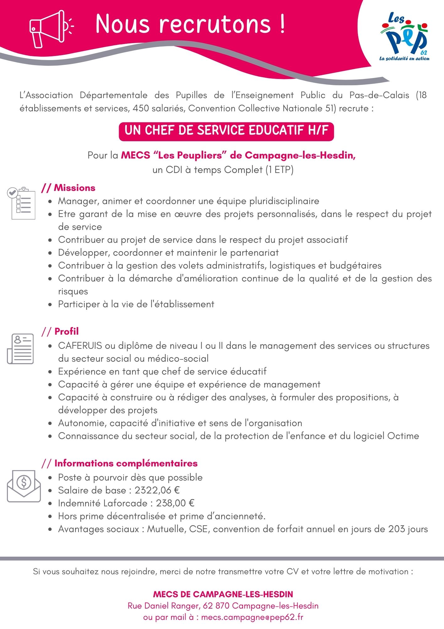 • La Maison d’Enfants de Campagne-les-Hesdin recherche un Chef de service éducatif H/F pour un CDI à Temps Complet (1 ETP)