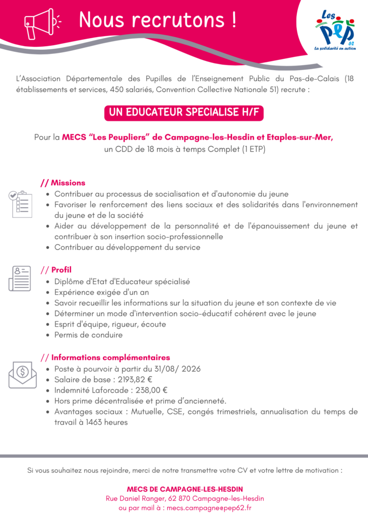• La Maison d’Enfants « les Peupliers » de Campagne-les-Hesdin recherche un Educateur Spécialisé pour un CDD de 18 mois à Temps Complet (1 ETP)
