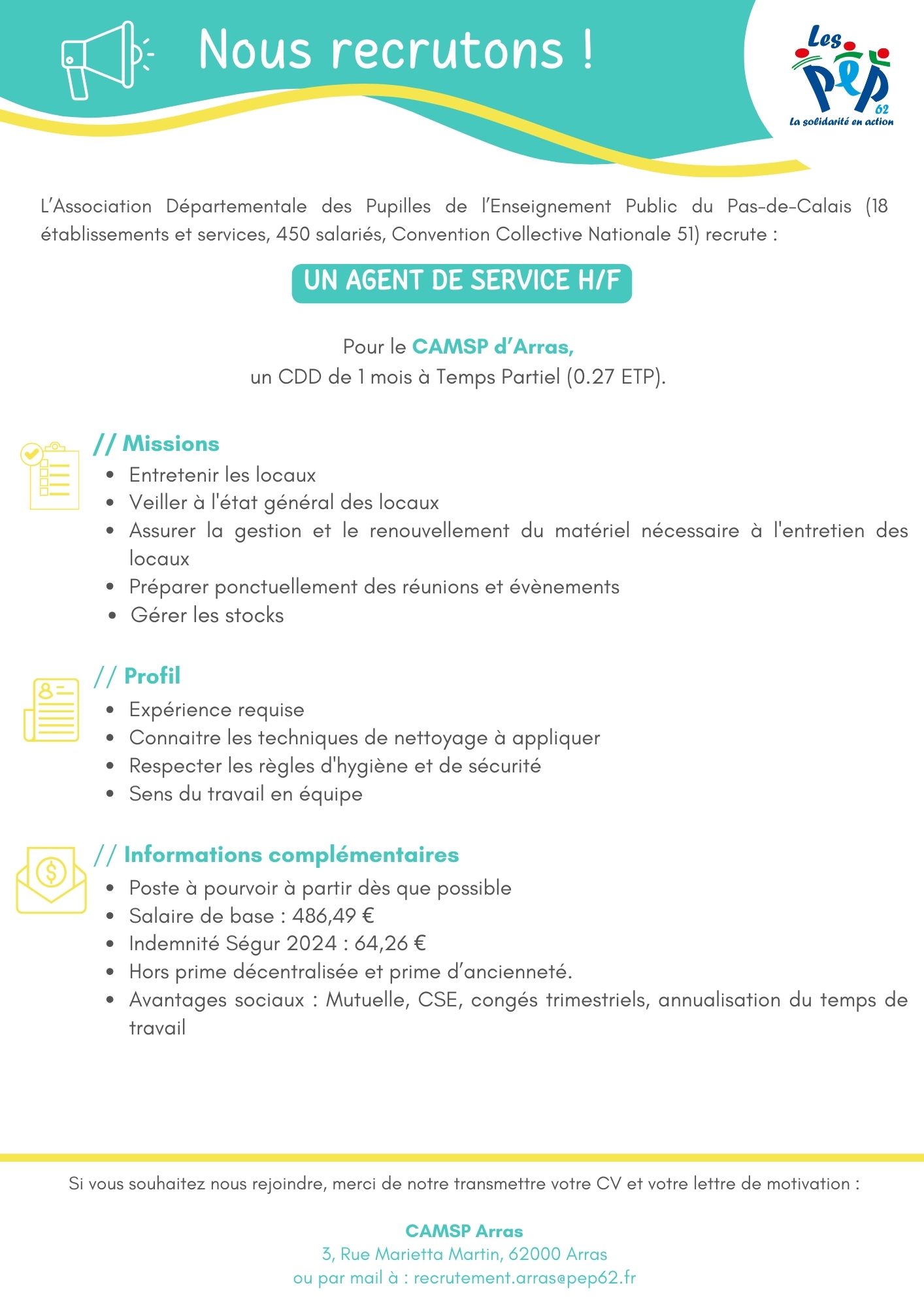 • Le CAMSP d’Arras recherche un Agent de service H/F pour un CDD de 1 mois à Temps Partiel (0.27 ETP)