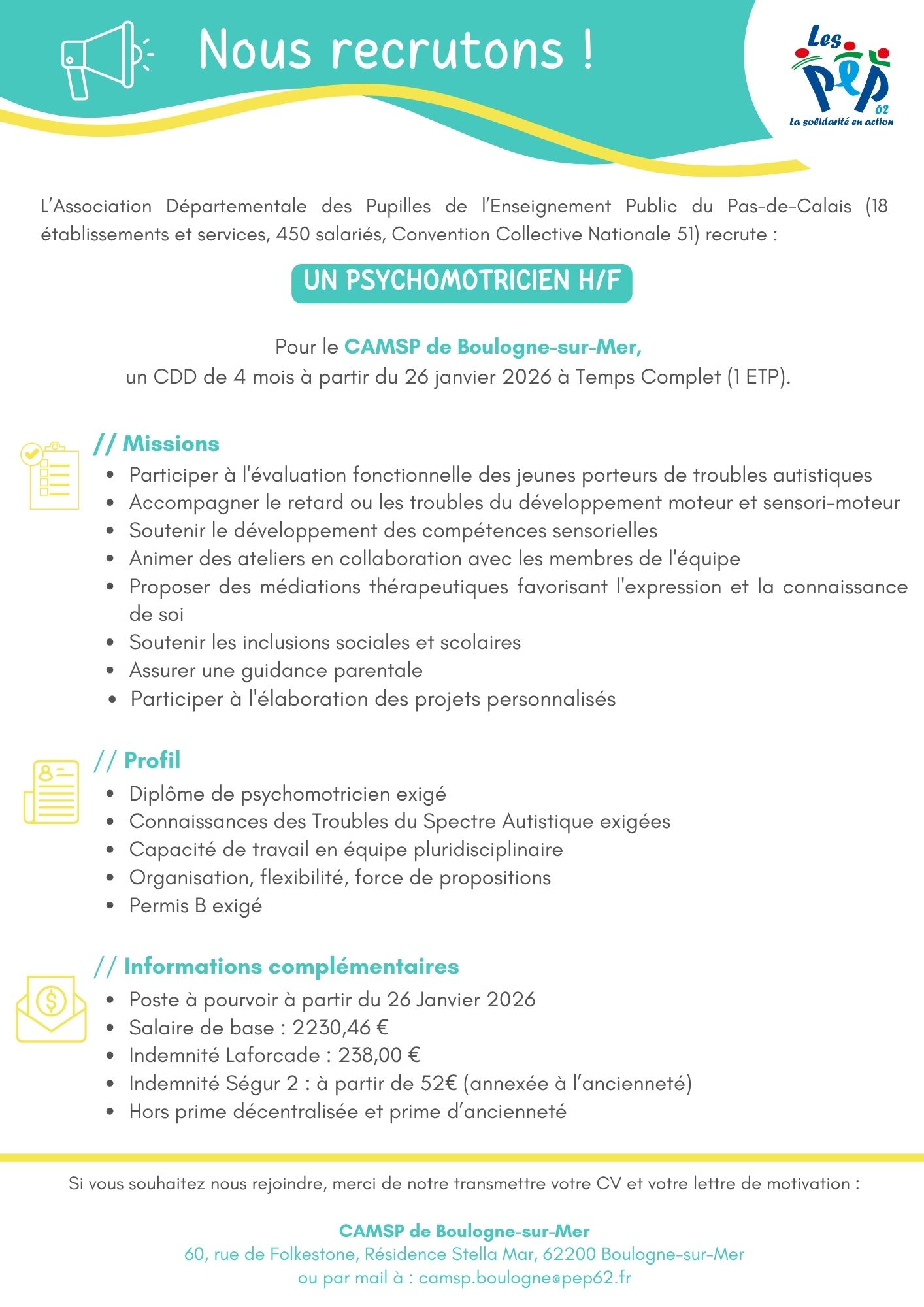 • Le CAMSP de Boulogne-sur-Mer recherche un Psychomotricien H/F pour un CDD à Temps Complet (1 ETP)