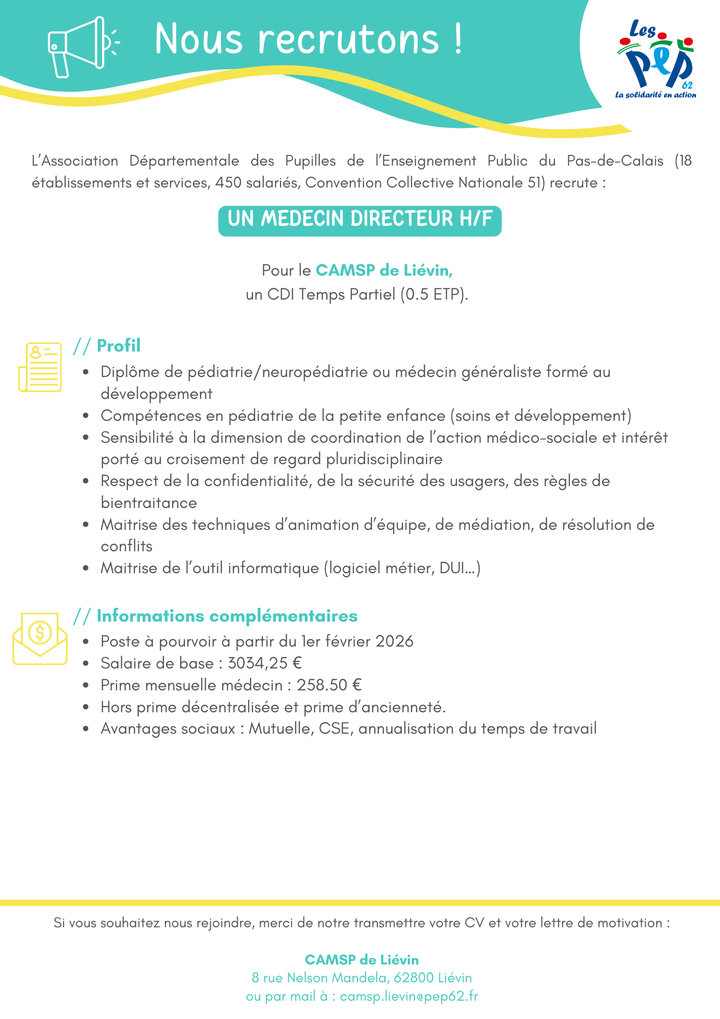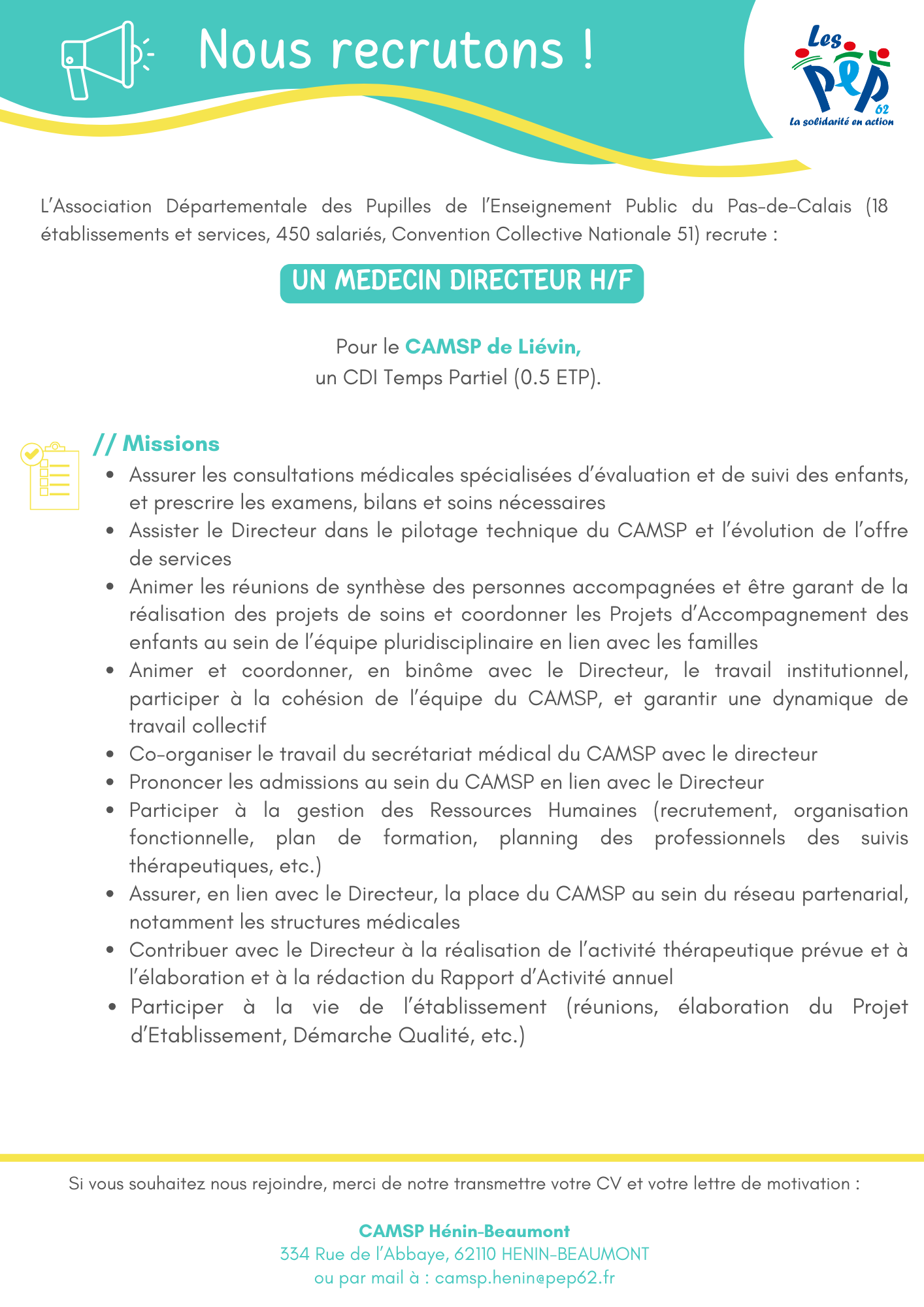 - Le CAMSP de Liévin recherche un Médecin Directeur H/F pour un CDI à Temps Partiel (0.5 ETP)