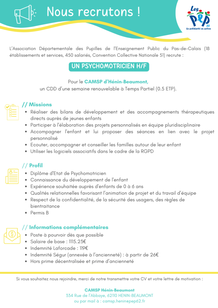 - Le CAMSP de Fouquières-lès-Béthune et son Equipe Mobile Petite Enfance recherche un Psychologue H/F pour un CDD de 9 mois à Temps Partiel (0.4 ETP)