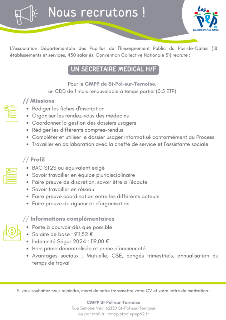 • Le CMPP de St-Pol-sur-Ternoise recherche un Secrétaire Médical H/F pour un CDD de 1 mois renouvelable à Temps Partiel (0.5 ETP)