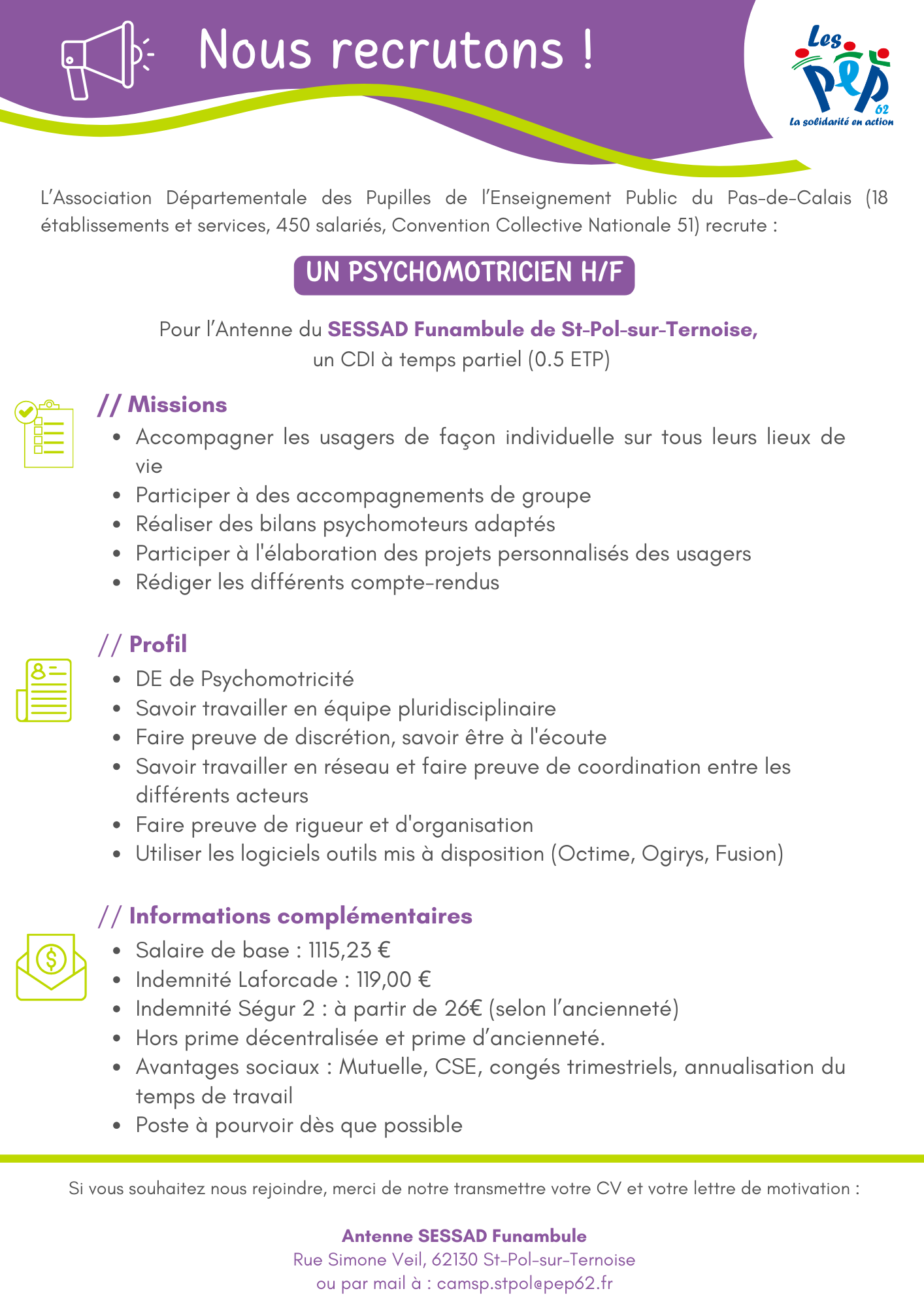 Le SESSAD Funambule de St-Pol-sur-Ternoise recherche un Psychomotricien H/F pour un CDI en Temps Partiel (0.5 ETP) Offres d'emploi Découvrez notre offre d’emploi en cliquant ici