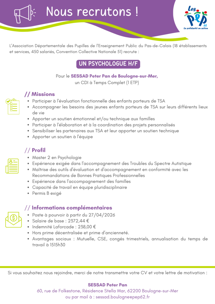 - Le SESSAD Peter Pan de Boulogne-sur-Mer recherche un Psychologue H/F pour un CDI à Temsp Complet (1 ETP)
