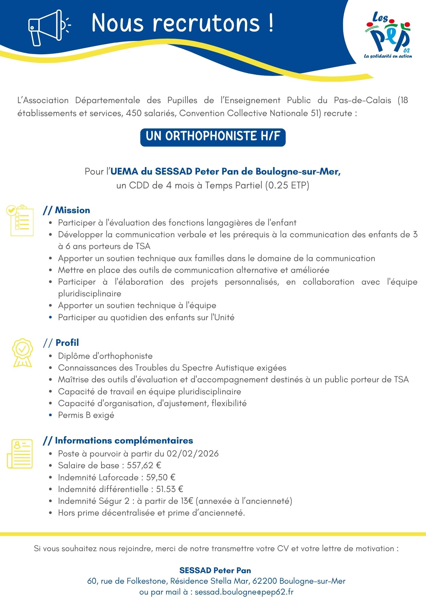 - L’UEMA du SESSAD Peter Pan de Boulogne-sur-Mer recherche un Orthophoniste pour un CDD de 4 mois à Temps Partiel (0.25 ETP)