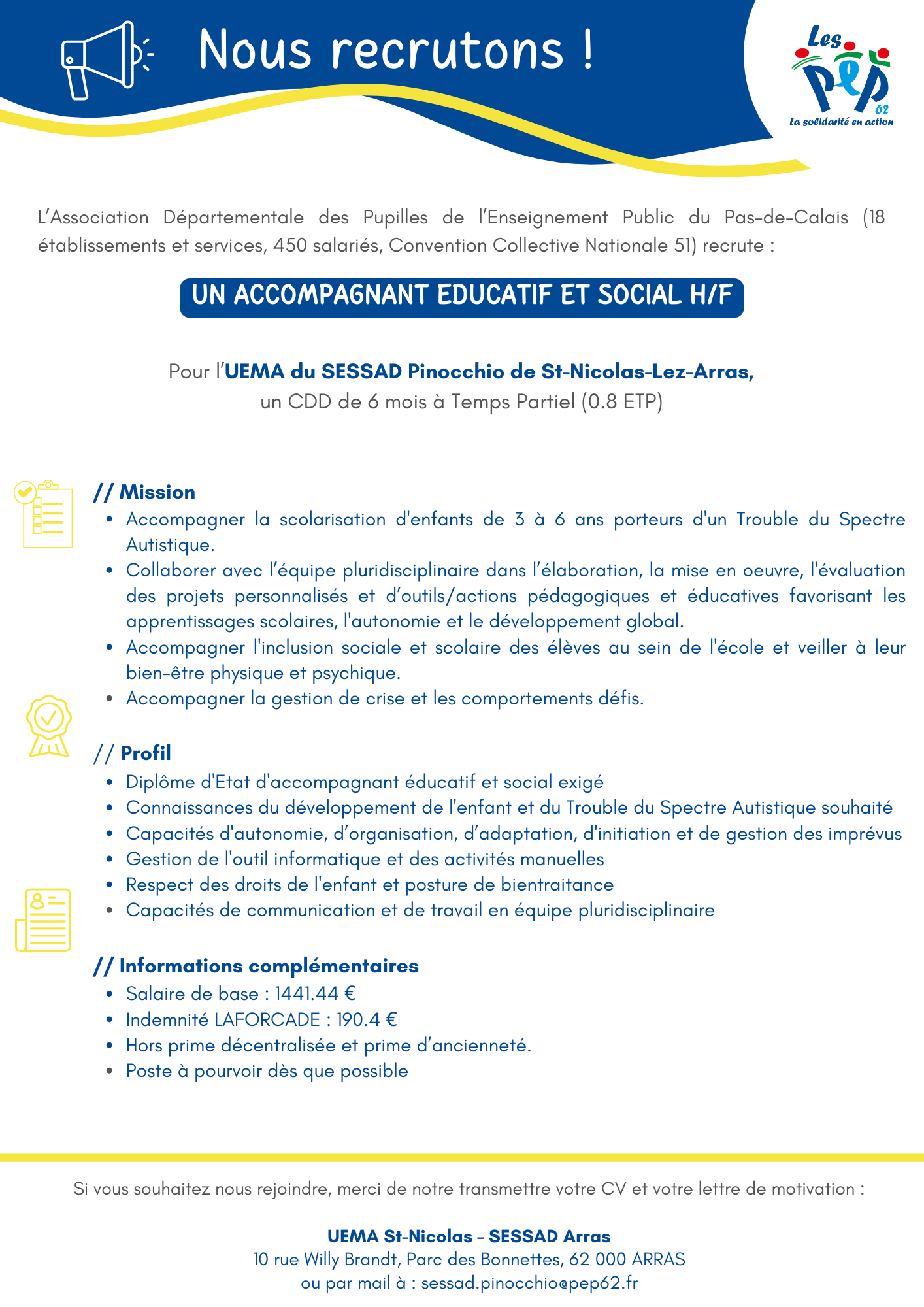 L’UEMA du SESSAD Pinocchio de St-Nicolas-lez-Arras recherche un Accompagnant Educatif et Social pour un CDD de 6 mois à Temps Partiel (0.8 ETP) Offres d'emploi >> Cliquez-ici pour télécharger cette offre d’emploi