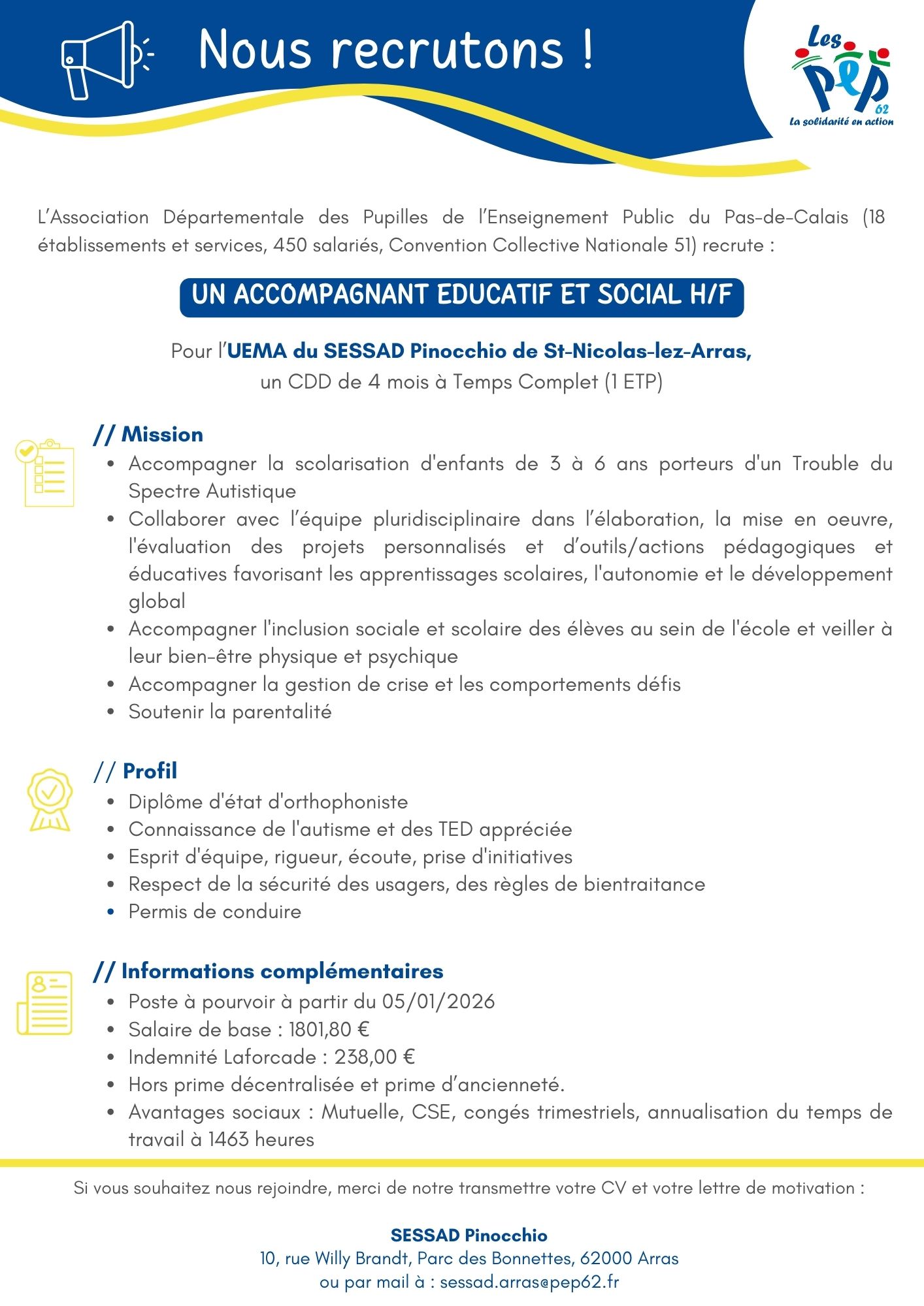 - L’UEMA du SESSAD Pinocchio de St-Nicolas-lez-Arras recherche un Accompagnement Educatif et Social H/F pour un CDD de 4 mois à Temps Complet (1 ETP)