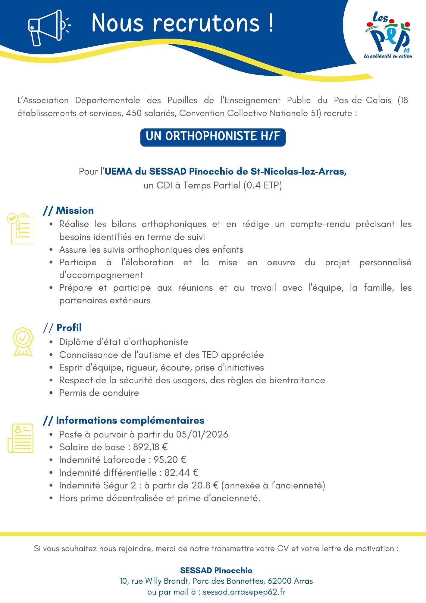 • L’UEMA du SESSAD Pinocchio de St-Nicolas-lez-Arras recherche un Orthophoniste pour un CDI à Temps Partiel (0.4 ETP)